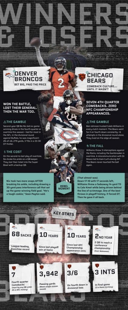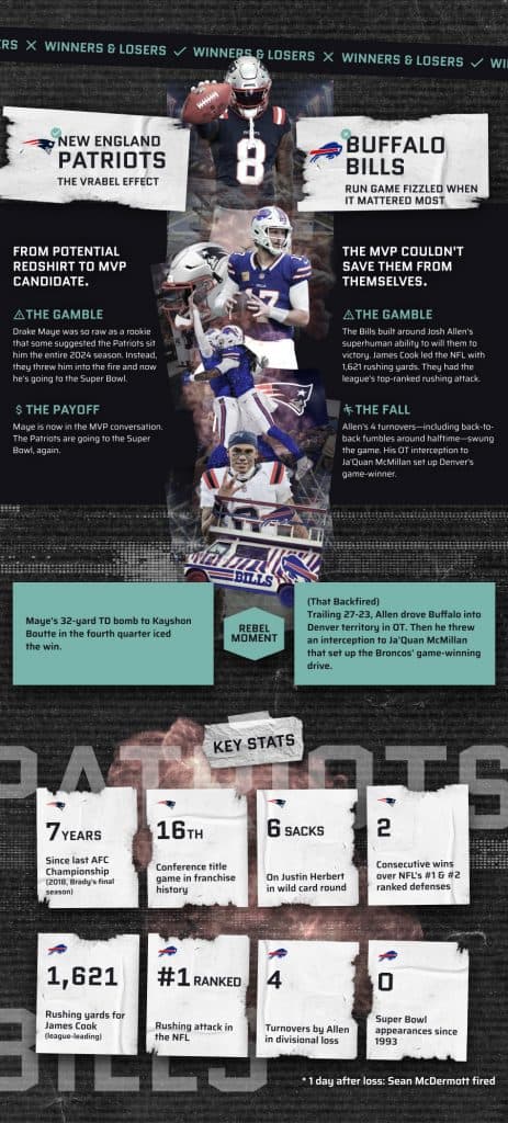 For every winner, there’s heartbreak. Josh Allen’s 4 turnovers ended Buffalo’s clearest path to a Super Bowl in decades. Sean McDermott was fired the next morning. In Chicago, Caleb Williams’ brilliance was undone by his mistakes—7 fourth-quarter comebacks all season, then 3 interceptions when it mattered most.